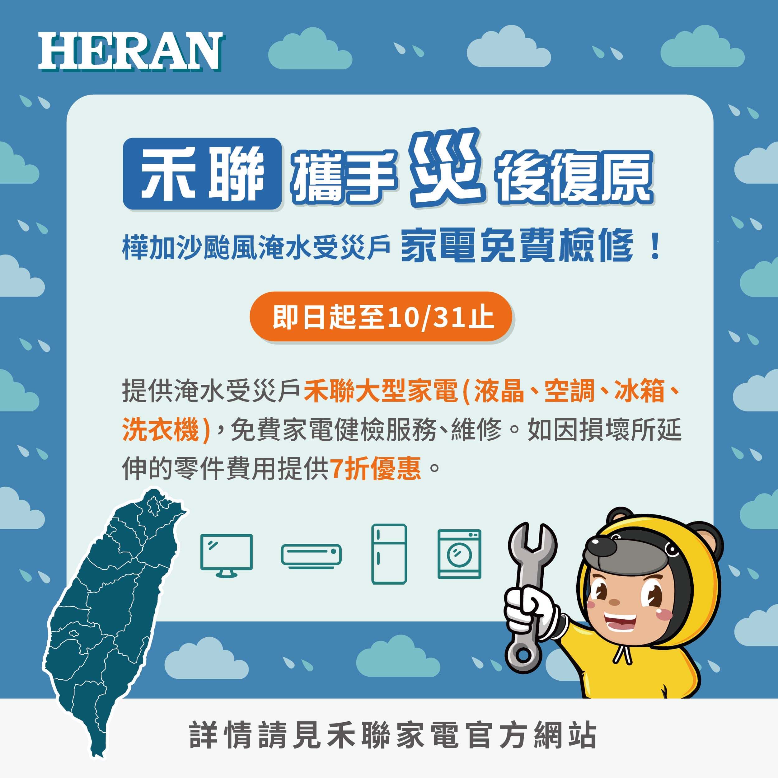 ■優惠內容:禾聯大型家電(液晶、空調、冰箱、洗衣機)提供免費家電健檢及維修服務 ;因災損壞所延伸之零件提供7折優惠。