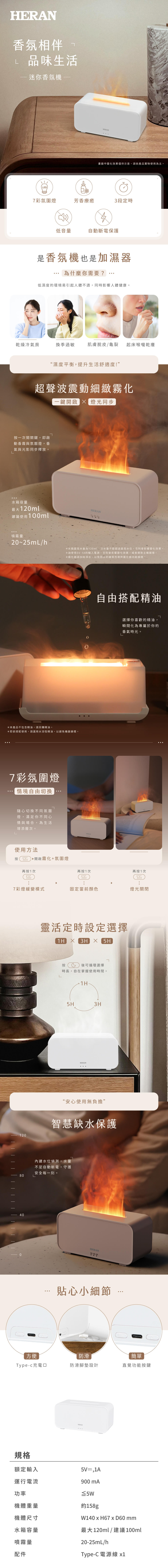 ● 大口徑水箱方便加水 ● 7彩LED燈光營造多種氛圍 ● 可加香薰精油(純精油/水性精油) ● 缺水自動停止運作 ● 3段定時設定(1H、3H、5H)