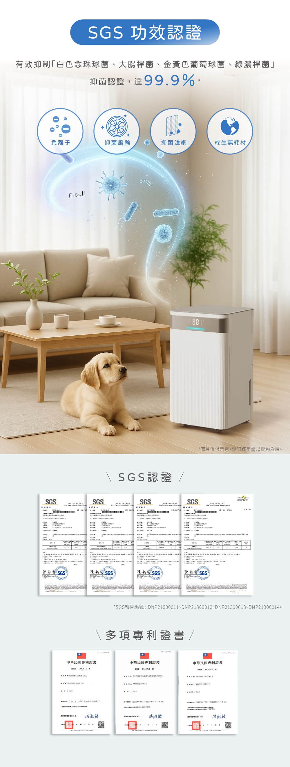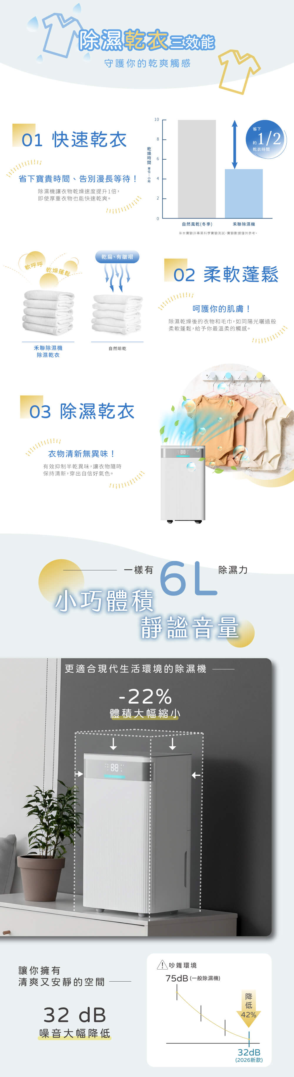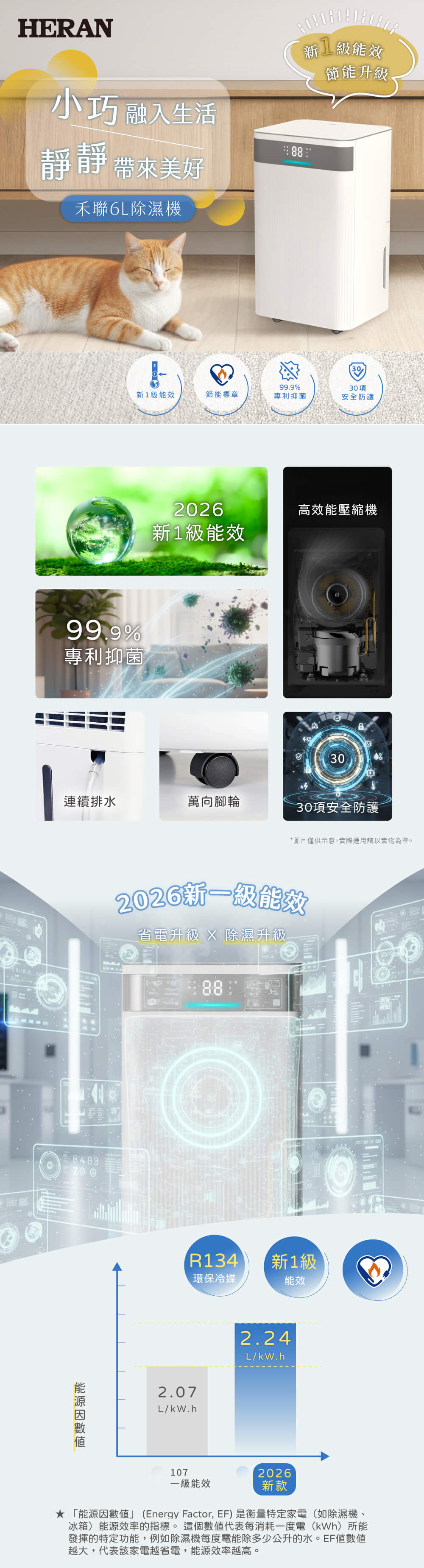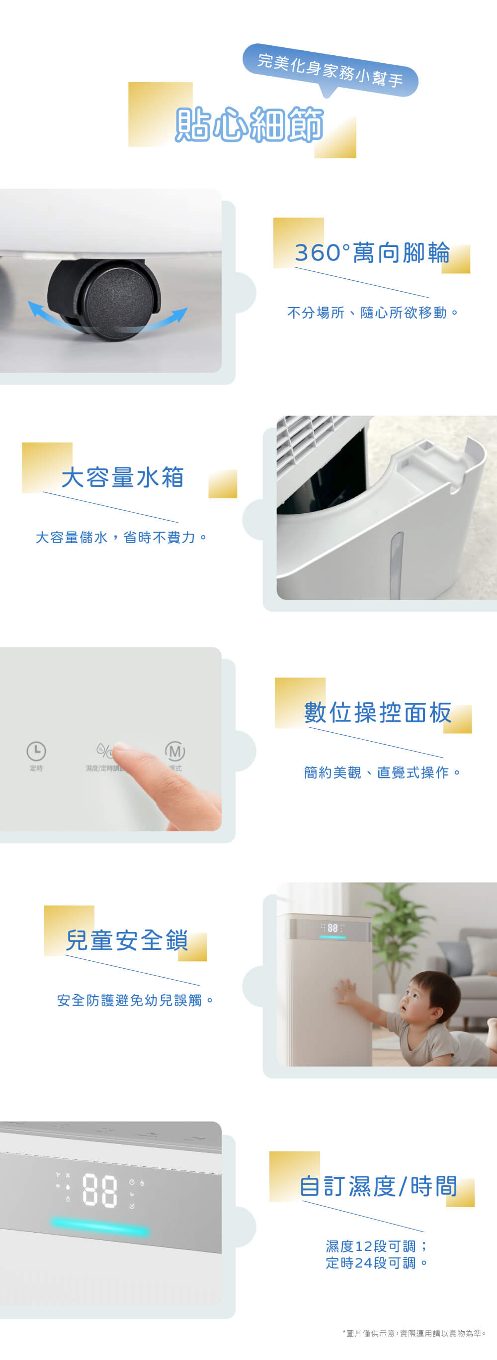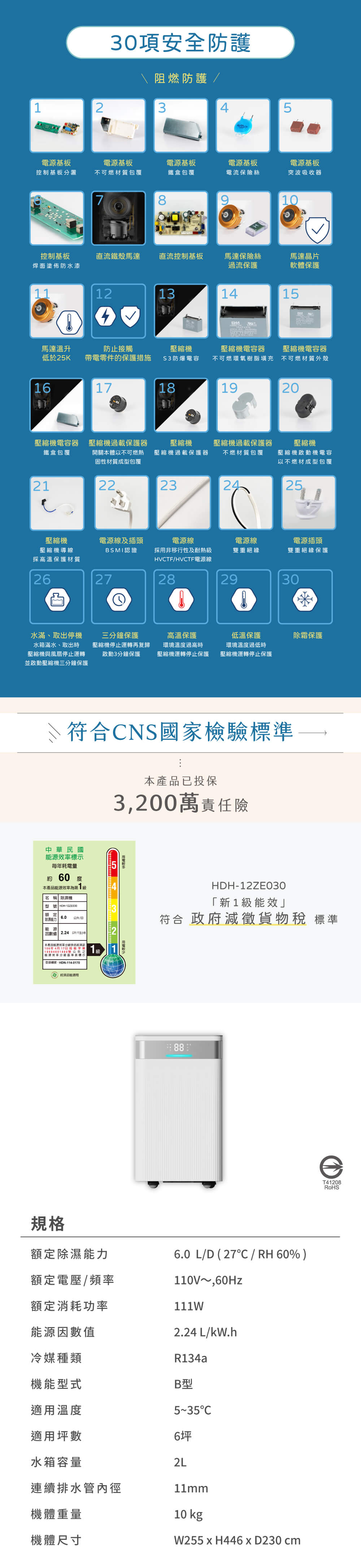 ● 新一級能效 ● 30項安全配備 ● 數位操控面板 ● 兒童安全鎖 ● 負離子淨化 ● 2.0L大容量水箱 ● 連續排水 ● 除濕/乾衣模式 ● 定時控制 ● 萬向腳輪