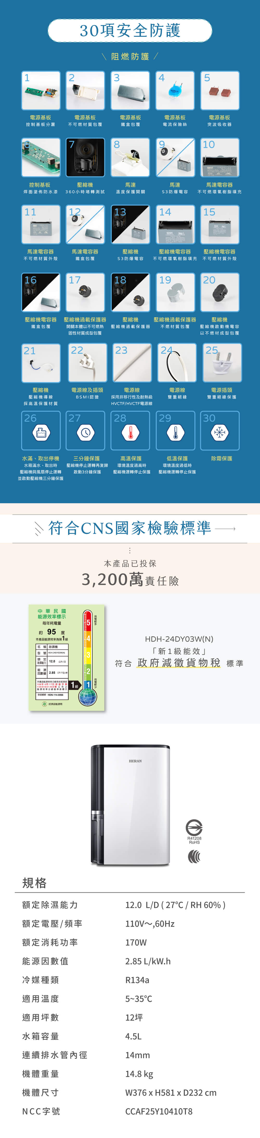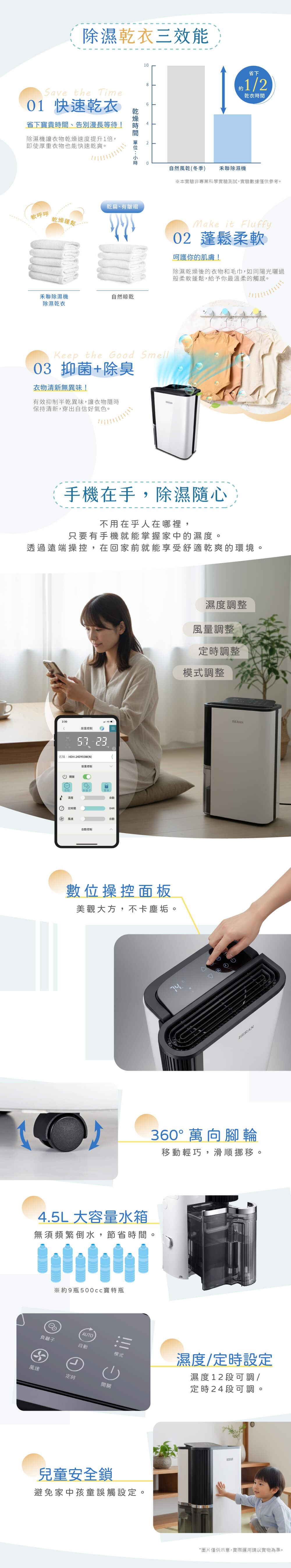 ● 新一級能效 ● 30項安全配備 ● 台灣品牌壓縮機 ● IOT智慧聯網 ● 負離子、奈米銀粒子抑菌 ● 4.5L大容量水箱 ● 連續排水 ● 除濕/乾衣模式 ● 定向控制 ● 萬向腳輪